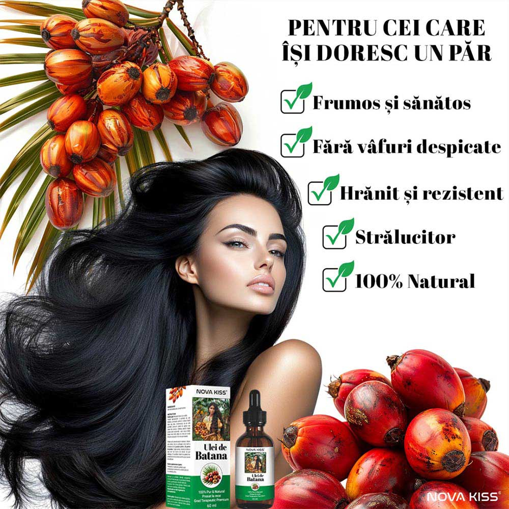 Calitate Premium, Fără Adaosuri: Uleiul Esențial Premium de Batana NOVA KISS® este 100% pur și natural, fără adaosuri sau substanțe chimice, fiind obținut prin metode tradiționale care păstrează intacte toate proprietățile sale benefice. Acest ulei versatil poate fi folosit singur sau combinat cu alte uleiuri esențiale pentru a crea o gamă largă de tratamente personalizate pentru păr și piele.